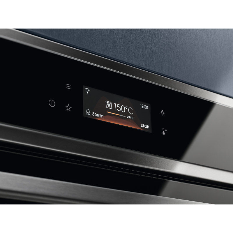 Elektronske funkcije pećnice: minutni podsjetnik, Oven light on/off selectable (menu + direct access button), Pyrolytic cleaning (3 cycles: quick. normal. intense), Real temperature indication (°C), indikator rezidualne topline (C stupnjevi), korištenje rezidualne topline, Service info, isključivanje u određeno vrijeme u off statusu, prijedlog temperature, vrijeme u danu, 160 variety of pre-set cooking programmes “Assist” (weight/food sensor), 3 Favorites, 3 pirolitička ciklusa, 30 Languages, zvučni signal, App control, Automatic safety switch off only oven, podesiva razine zvuka , Check Result (Finish Assist by remaining 10% duration), Child lock (in off mode), podsjetnik za čišćenje, Clock style in standby (2 versions), Connectivity, Cooking with Duration, Cooking with End Time and Duration, Demo mode with code, Display Brightness adjustable (ON status), Display Full colour TFT touch 95x35mm, elektronska regulacije temperature, elektronsko zaključavanje, odabir brzog zagrijavanja, sonda za meso, automatsko isključivanje sonde za meso, indikator toplne jezgre pomoću sonde, Food sensor time estimation, održavanje topline na 65°C pomoću sonde za meso, Key tones & alarm/error tones activation/deactivation (except On/Off), jezici/tekst zaslona, glavni prekidač, Memory day time 3 days