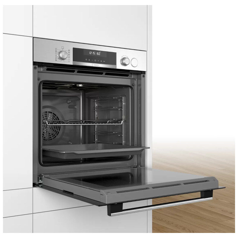 Ugradbena pećnica Bosch HRA578BS6 može se pohvaliti kapacitetom od 71 l, tri nivoa pečenja, halogenom rasvjetom za cjelovit pregled procesa pečenja i mnogim pametnim značajkama. Pećnica je povezana s mobilnom aplikacijom HomeConnect putem koje možete lako upravljati i nadzirati.