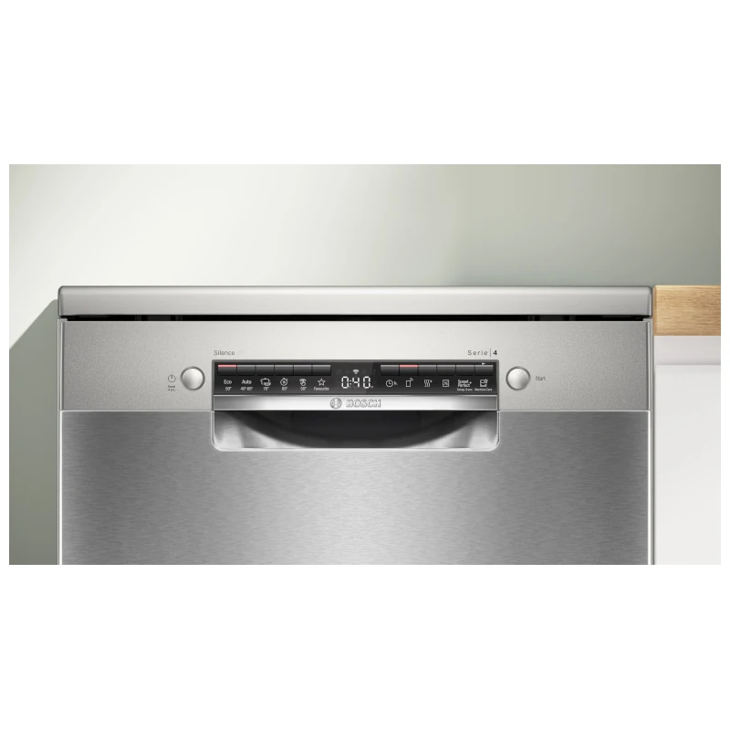 Bosch Serie 4, samostojeća perilica posuđa, 60 cm, nehrđajući čelik. Perilica ima kapacitet pranja za 13 setova posuda. Fleksibilno punjenje i pametno daljinsko upravljanje perilicom putem aplikacije Home Connect. Opcija iznimno temeljitog sušenja za posuđe koje se teško suši. Košare VarioFlex: poboljšana fleksibilnost prilagođavanja košare stvara više prostora za vaše posuđe. Silence on demand: do 30 min smanjenja buke u bilo kojem trenutku putem aplikacije Home Connect. Brojač tableta vam omogućuje da pratite preostale tablete u perilici posuđa i obavještava vas kada se ponestane. Energetski razred D.