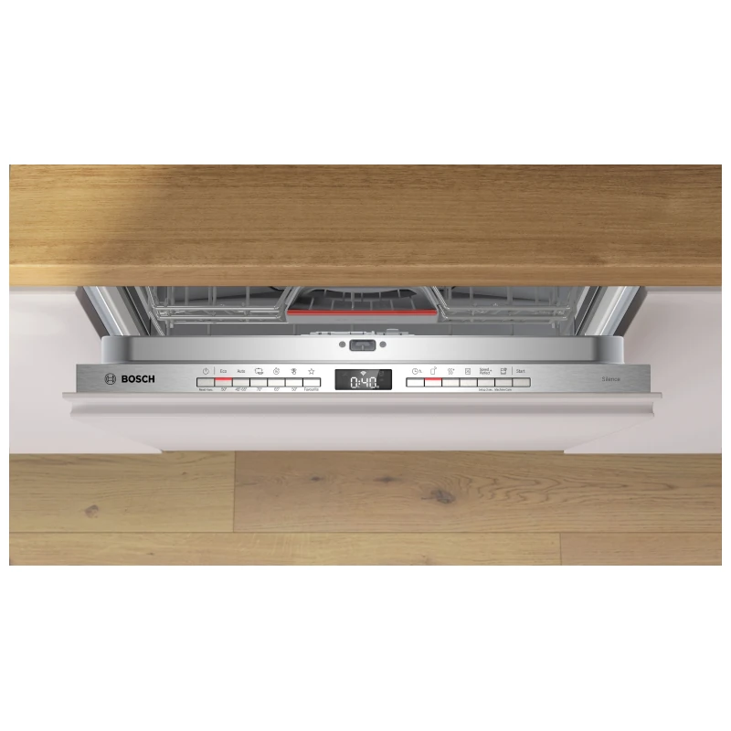Bosch ugradbena perilica posuđa, Serie 4, širine 60 cm XXL. Fleksibilno punjenje i pametno daljinsko upravljanje perilicom putem aplikacije Home Connect, čak i za kuhinje s niskim visinama postolja i visokim ugradbenim prostorima. Opcija iznimno temeljitog sušenja za posuđe koje se teško suši. Košare VarioFlex i VarioDrawer: poboljšane mogućnosti prilagodbe uz dodatan prostor na svim razinama. Silence on demand: do 30 min smanjenja buke u bilo kojem trenutku putem aplikacije Home Connect. Brojač tableta vam omogućuje da pratite preostale tablete u perilici posuđa i obavještava vas kada se ponestane. Energetski razred: D.