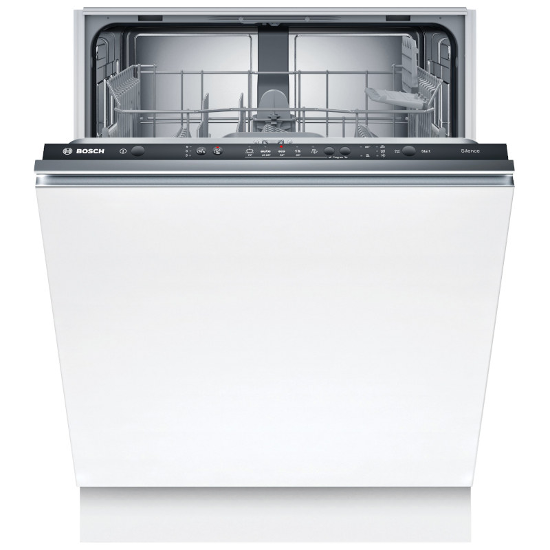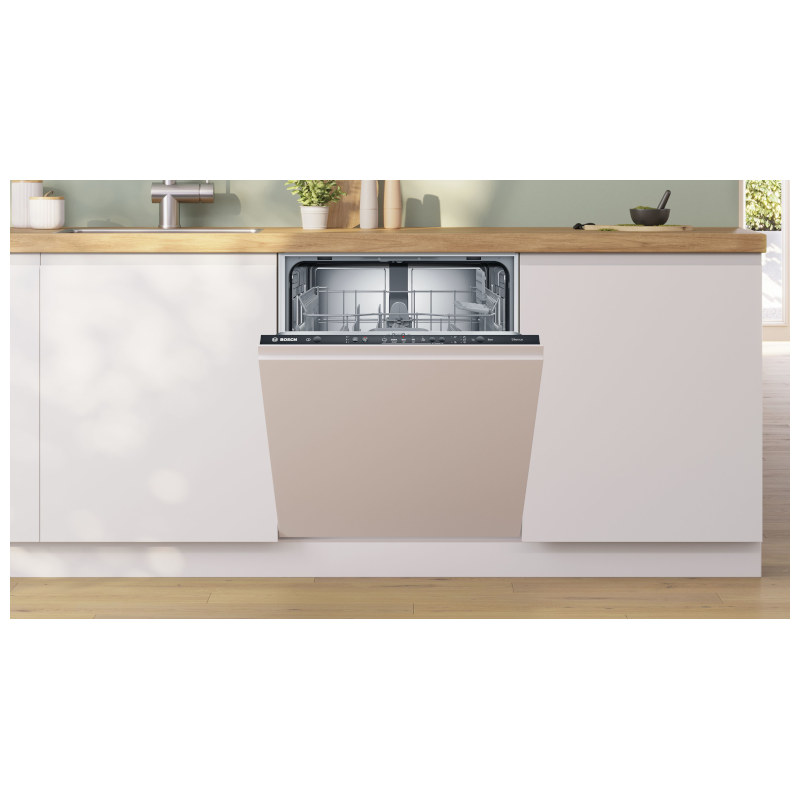 Bosch ugradbena perilica posuđa, Serie 2, širine 60 cm. Gornja košara podesive visine: pruža dodatni prostor, osobito za visoko posuđe. InfoLight: crveno svjetlo na podu pokazuje je li perilica posuđa uključena ili isključena. Silence Plus: ugodno tiho s 48 dB. AquaStop: štiti od propuštanja i ima 100% doživotno jamstvo. Motor EcoSilence: podržava izuzetnu uštedu energiju i odlikuje se tihim radom uz dugačak životni vijek. Energetski razred: E.