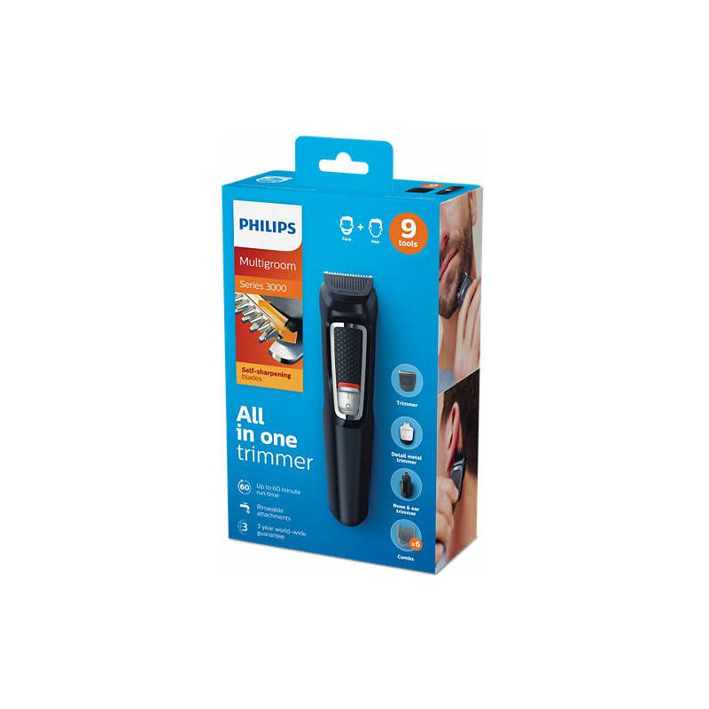 Trimer PHILIPS MG3740/15, 9 u 1, za kosu i braduŠišanje / oblikovanje dlačica na licu: Dugačka brada, Kratka brada, Kratka oštra brada, Oštre linije, Precizno oblikovanje, Kozja bradicaVrijeme rada: 60 minutaBroj nastavaka: 9 nastavakaVrsta baterije: NiMHAutomatski napon: 100 – 240 VBrand: PhilipsOdržavanje: Četka za čišćenjePunjenje: 16 sati za potpuno punjenjeBez potrebe za održavanjem: Nije potrebno podmazivanjeTorbica: DaČišćenje: Nastavci koji se mogu ispratiPribor za oblikovanje frizure: Trimer, Detaljni metalni podrezivač, Trimer za nos i uši, Prilagodljivi češalj za bradu od 3 – 7 mm, 2 češlja za kratku bradu, 3 češlja za kosuOštrice koje se same oštre: DaPostignite savršeno podrezivanje, uporabu za uporabom. Čelične oštrice lagano se dodiruju i tako se oštre tijekom rada. Zbog toga su i nakon 3 godine uporabe jednako oštre kao i prvog dana.Ovaj podrezivač sve u jednom praktično podrezuje i oblikuje dlačice na licu te kosu.Koristite podrezivač bez češlja za postizanje čistih, oštrih linija oko brade, vrata i kose. Oštrice podrezivača same se oštre i čak nakon 3 godine uporabe ostaju jednako oštre kao i prvog dana.Precizno kreirajte fine linije, konture i detalje za definiranje ili promjenu svog stila.Uklonite neželjene dlačice iz nosa i ušiju na jednostavan i ugodan način.2 češlja za čekinjastu bradu (1, 2 mm), 1 prilagodljivi češalj za bradu (3 – 7 mm) i 3 češlja za kosu (9, 12, 16 mm).Nakon 16 sati punjenja na raspolaganju imate do 60 minuta bežične uporabe.Jednostavno odvojite i isperite oštrice i češljeve pod mlazom vode iz slavine kako biste ih temeljito oprali.Koristite praktičnu torbicu za spremanje ili putovanje. U nju možete spremiti i tako zaštititi podrezivač i sve njegove nastavke dok ste u pokretu.