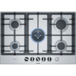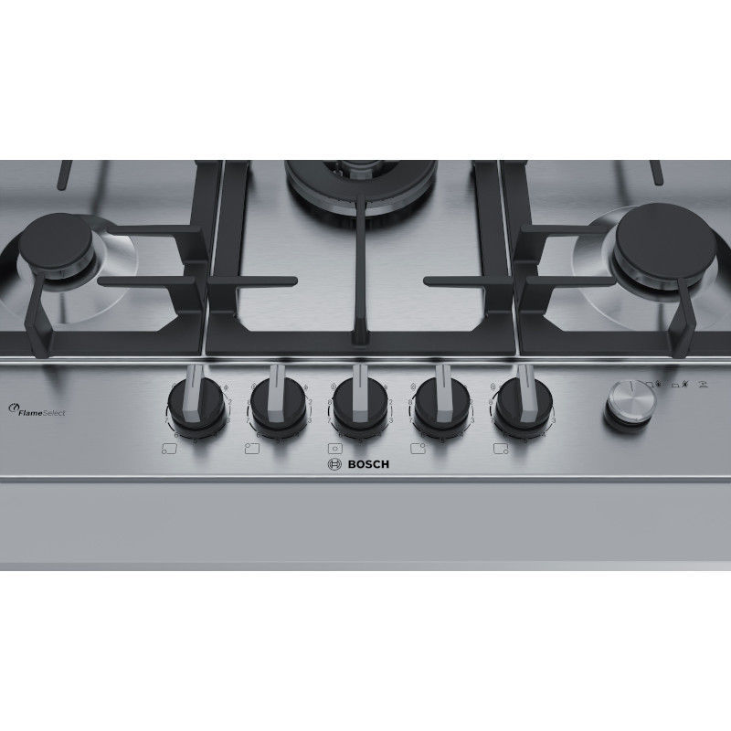 Bosch plinska ploča za kuhanje, širina: 75 cm, nehrđajući čelik. 5 plinskih plamenika. FlameSelect: za precizno namještanje plamena na devet definiranih razina. Glavna sklopka: isključuje cijelu zonu za kuhanje pritiskom na tipku. Dvostruki električni plamenik s dvije mogućnosti grijanja, brzo zakipljuje vodu ili održava precizno vrenje. Rešetke za lonce od lijevanog željeza u jednom komadu: za čvrstoću i stabilnost posuđa za kuhanje. Spremni za biometan: vašu je plinsku ploču za kuhanje moguće napajati i obnovljivim plinom biometanom.