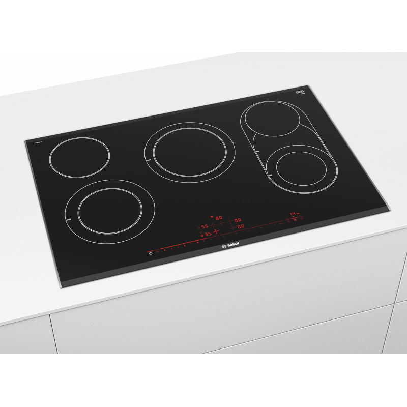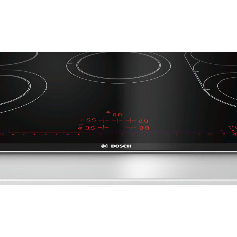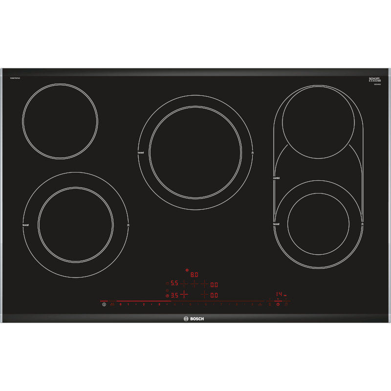 Serie 8, Električna ploča za kuhanje, 80 cm. DirectSelect Premium: prostrano i intuitivno sučelje zaslona na dodir. CombiZone: Više fleksibilnosti s kombiniranjem dvaju zona, za posude za prženje i slično. ReStart: ako nešto prekipi, ploča za kuhanje će se automatski isključiti i pohraniti posljednju odabranu postavku. Ukupan broj polja koja se mogu istovremeno upotrebljavati: 5.