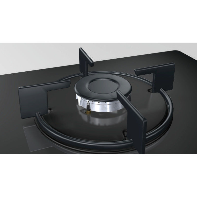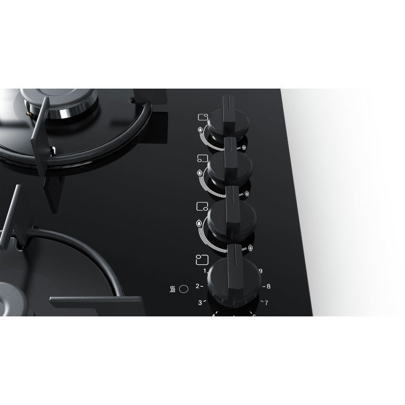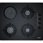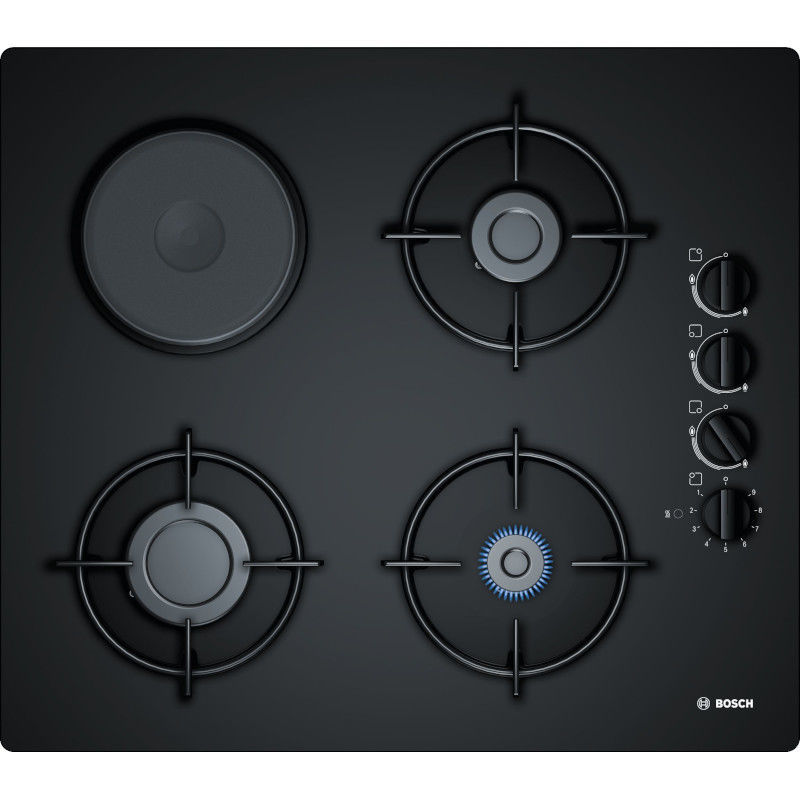 Bosch kombinirana ploča za kuhanje (plin i struja), širina: 60 cm, crna boja. Ploča za kuhanje na kaljenom staklu, 3 plinska plamenika, 1 strojno polje za kuhanje. Plinska ploča za kuhanje s bočnim kontrolama: željene zone kuhanja lako se podešavaju bočnim kontrolama. Ergonomski gumbi: za ergonomsko upravljanje.