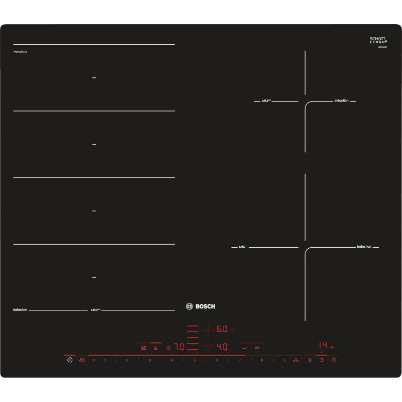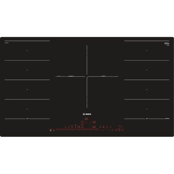 Bosch indukcijska ploča za kuhanje, širina: 60 cm, crna boja. 4 indukcijska polja za kuhanje, podešavanje snage: 17 stupnjeva. Indukcijska ploča s funkcijom PerfectFry: postignite savršene rezultate pečenja zahvaljujući automatskoj kontroli temperature. DirectSelect Premium: izravan, jednostavan odabir željene zone kuhanja, snage i dodatnih funkcija. FlexInduction zona: Veća fleksibilnost s kombiniranjem zona kuhanja u jednu veliku zonu za manje lonce i veliko kuhinjsko posuđe. PerfectFry: za savršeno pečenje hrane zahvaljujući senzorskoj kontroli s 5 razina snage. Plosnata ugradnja u kamenu ili granitnu radnu površinu. MoveMode: automatsko postavljanje razine kuhanja omogućava brzo vrenje s prednje strane i krčkanje na stražnjoj zoni kuhanja.