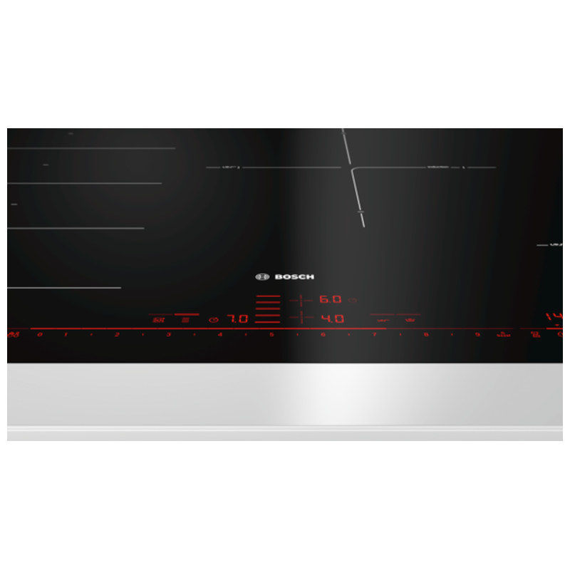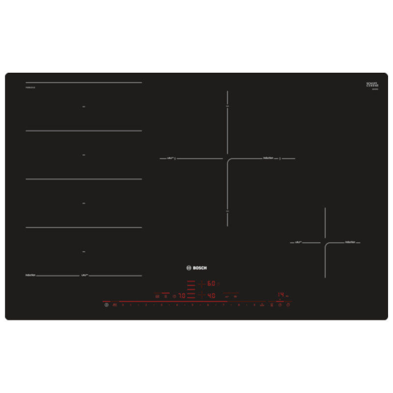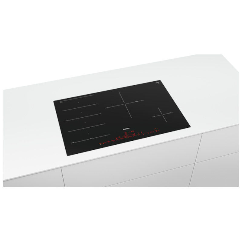 Bosch indukcijska ploča za kuhanje, širina: 80 cm, crna. Indukcijska ploča s funkcijom PerfectFry: postignite savršene rezultate pečenja zahvaljujući automatskoj kontroli temperature. 4 indukcijska polja za kuhanje, FlexInduction polje – veća fleksibilnost s kombiniranjem zona kuhanja u jednu veliku zonu za manje lonce i veliko kuhinjsko posuđe. PerfectFry: za savršeno pečenje hrane zahvaljujući senzorskoj kontroli s 5 razina snage. Plosnata ugradnja u kamenu ili granitnu radnu površinu. MoveMode: automatsko postavljanje razine kuhanja omogućava brzo vrenje s prednje strane i krčkanje na stražnjoj zoni kuhanja.
