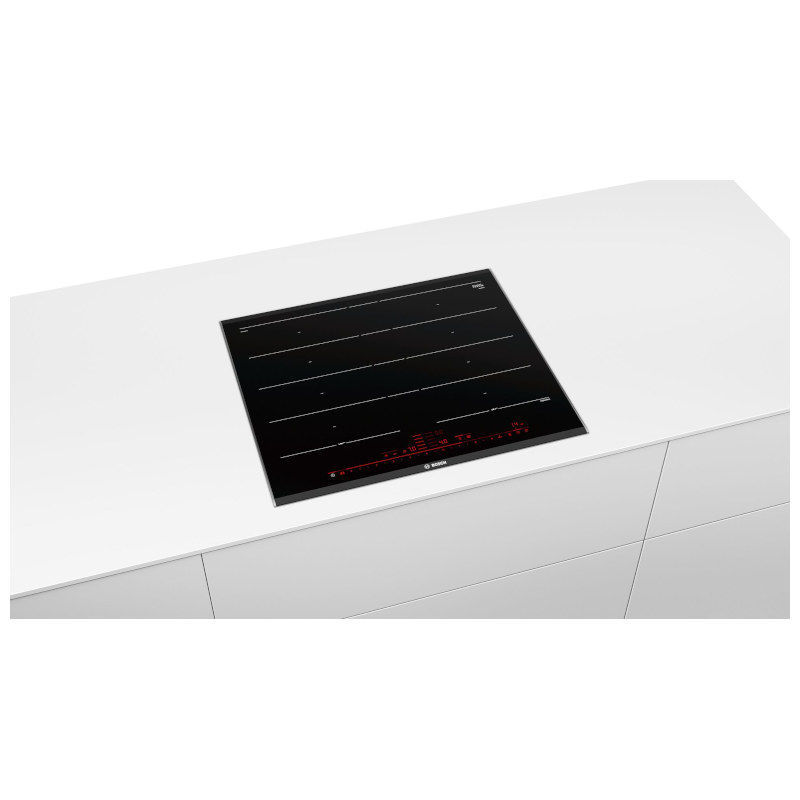 Bosch indukcijska ploča za kuhanje, širina: 60 cm, crna boja. DirectSelect Premium: prostrano i intuitivno sučelje zaslona na dodir. Extended FlexZone: maksimalno prostora za veliko posuđe na ploči za kuhanje. PerfectFry: više ne morate brinuti da će vam hrana zagorjeti. MoveMode: automatsko postavljanje razine kuhanja omogućava brzo vrenje s prednje strane i krčkanje na stražnjoj zoni kuhanja. Automatski prijenos postavki: jednostavno upravljanje pločom za kuhanje.