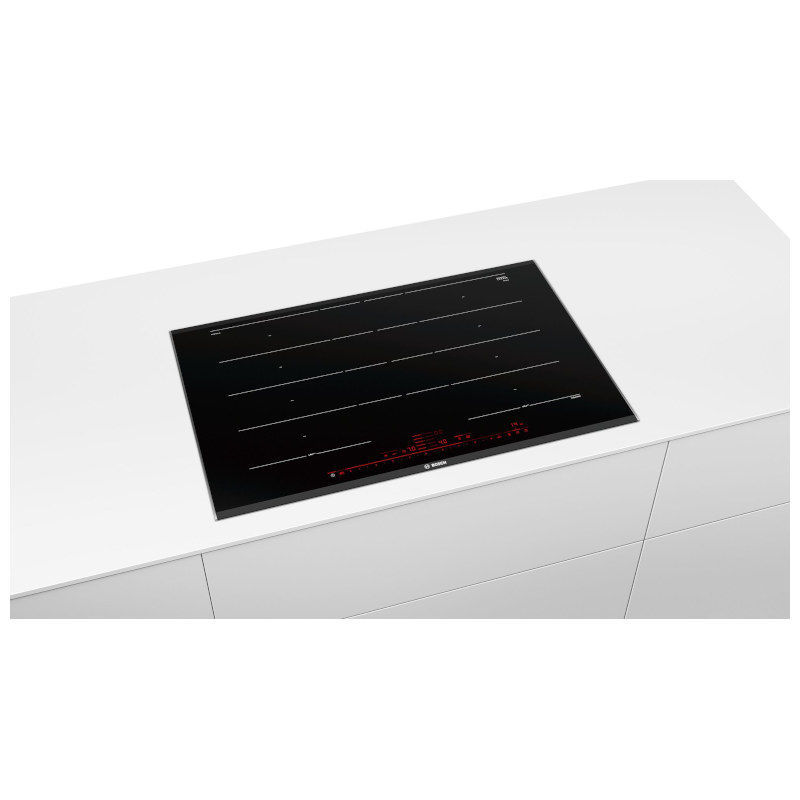 Bosch indukcijska ploča za kuhanje, širina: 80 cm, crna boja. DirectSelect Premium: prostrano i intuitivno sučelje zaslona na dodir. Extended FlexZone: maksimalno prostora za veliko posuđe na ploči za kuhanje. PerfectFry: više ne morate brinuti da će vam hrana zagorjeti. MoveMode: automatsko postavljanje razine kuhanja omogućava brzo vrenje s prednje strane i krčkanje na stražnjoj zoni kuhanja. Automatski prijenos postavki: jednostavno upravljanje pločom za kuhanje.
