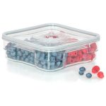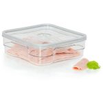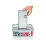 Sve gastro vakuumske posude imaju jednaku širinu i dužinu (22,5 x 22,5 cm), različita je samo visina. Jedan vakuumski poklopac odgovara svim vakuumskim posudama. Pune posude možete posložiti jednu na drugu i prazne jednu u drugu.