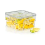 Sve gastro vakuumske posude imaju jednaku širinu i dužinu (22,5 x 22,5 cm), različita je samo visina. Jedan vakuumski poklopac odgovara svim vakuumskim posudama. Pune posude možete posložiti jednu na drugu i prazne jednu u drugu.
