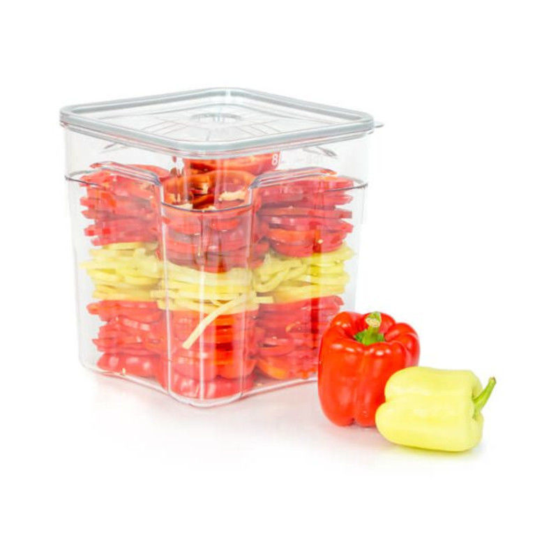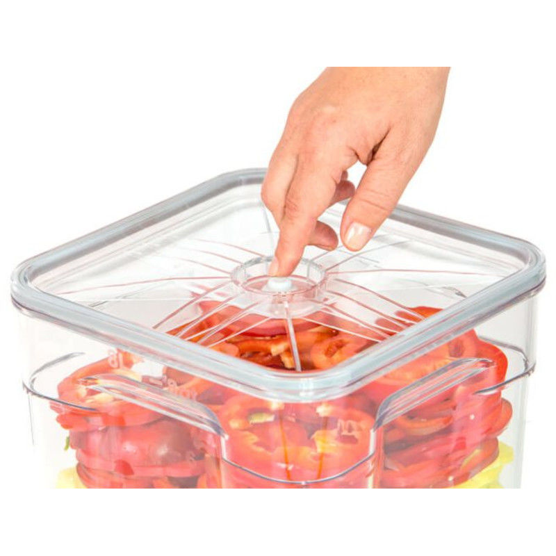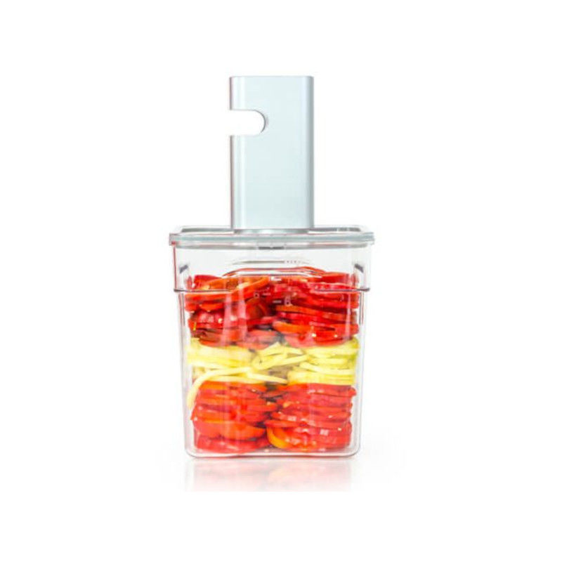 Sve gastro vakuumske posude imaju jednaku širinu i dužinu (22,5 x 22,5 cm), različita je samo visina. Jedan vakuumski poklopac odgovara svim vakuumskim posudama. Pune posude možete posložiti jednu na drugu i prazne jednu u drugu.