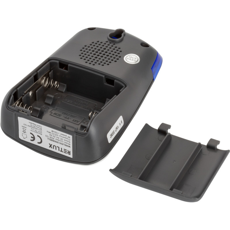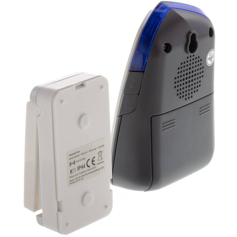 RDB 103 je bežično zvono na vratima s dometom do 150 metara. Specifikacije: Bežično zvono na vratima IP44 Napajanje: 3×1.5V (AA baterija)Odašiljač: IP44 kinetički (bez baterije) Frekvencija 433.92MHz raspon do 150 m (na otvorenom)Akustična signalizacija: 4 razine glasnoće Vizualna signalizacija: Dabroja melodija: 32 polifone melodije