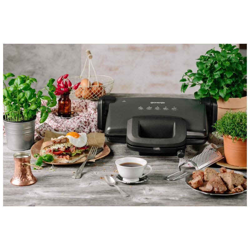 Gorenje električni roštilj, priključna snaga: 1800 W. Broj stupnjeva temperature za savršeno namještanje: 4, broj razina pečenja: 4. Širina ploče za pečenje: 34 cm, dubina ploče za pečenje: 23 cm. Dvostrane promjenjive ploče (jedna s grilom i jedna s ravnom površinom) čine ovaj roštilj svestranim i daju savršene rezultate, bez obzira na to kakav je vaš recept – od najdebljih odrezaka do najmekšeg povrća. Možete koristiti rebraste gril ploče za one savršene pruge od roštilja ili ravne ploče za jaja i palačinke.