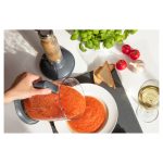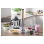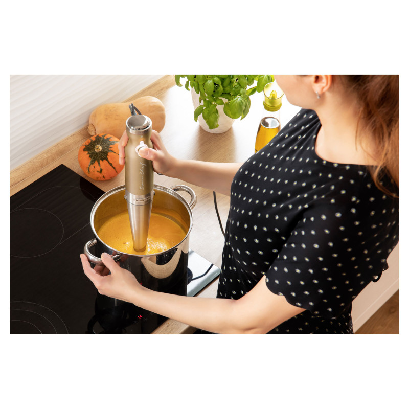 6-GODIŠNJE JAMSTVO za motor TITANIUM QuadBlade Tehnologija Ulaz snage 1 200 W Ekstra tišina Istosmjerni motor FUNKCIJE I SVOJSTVA Kontinuirana kontrola brzine (20 brzina)Ergonomski oblikovana ručkaNastavak od nehrđajućeg čelika koji se također može koristiti za miješanje vruće hraneoštrica za rezanje od nehrđajućeg čelika PRIBOR Čaša od 800 ml s poklopcem Dvostruki brk od nehrđajućeg čelika 1 250 ml sjeckalica s noževima od nehrđajućeg čelika DIMENZIJE I SPECIFIKACIJE Gumbi za otpuštanje privitka Viseća petljaDuljina kabelaza napajanje: 1,2 m