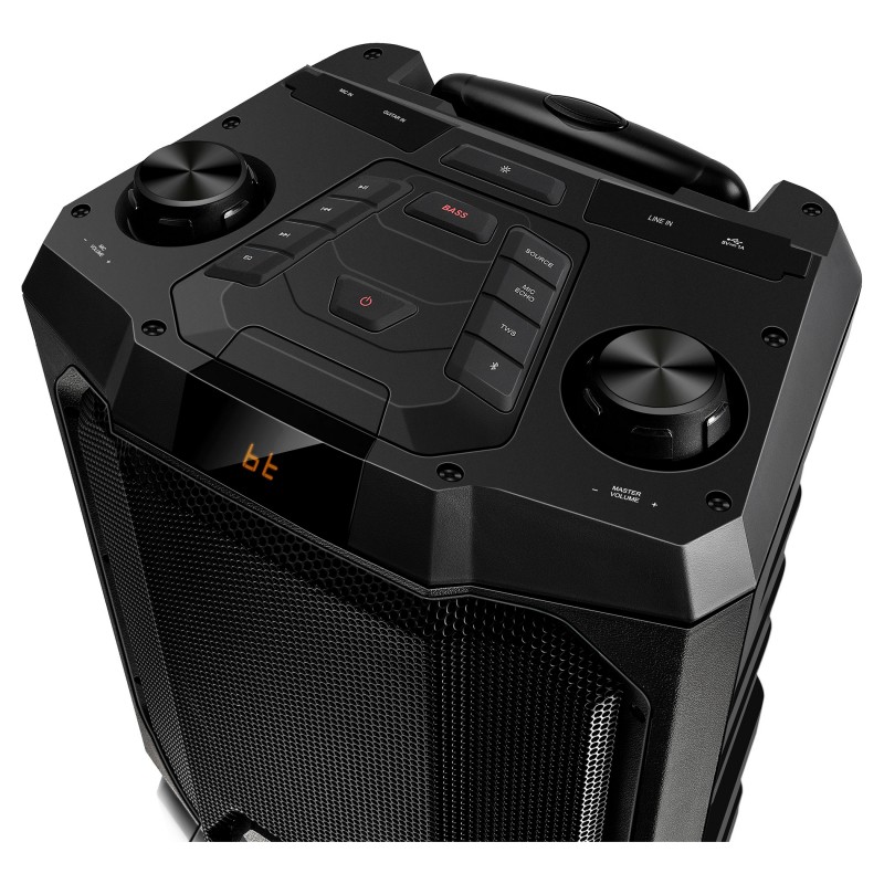 Zahvaljujući ugrađenoj punjivoj bateriji kapaciteta 4000 mAh može slušati glazbu do 9 sati pri srednjoj razini glasnoće. Kvalitetni zvuk osiguravaju 2 zvučnika s maksimalnom snagom od 50 W. Svoju omiljenu glazbu možete reproducirati putem Bluetooth bežičnog sučelja s rasponom do 20 metara, putem USB stick-a, tvrdog diska ili drugog uređaja pomoću priključka od 3,5 mm Jack. Zvučnici su osvijetljeni LED-ima i postoji 7 moda.Zaštita od vode IPX4Snaga:Ručica koja se uvlači 50 W za lakše rukovanjeLED zaslonomTreperi LED rasvjetaTWS (True Wireless Stereo) funkcija ZVUK: Izlazna snaga: 50 W2 zvučnika (1 srednji bas + 1 visoki tonski)Frekvencijski odziv: 20 Hz – 17 kHzUkupno harmonično izobličenje: ≤ 10% (1 kHz)Unaprijed postavljeni načini izjednačavanja (tipka ROCK, POP, JAZZ, …) SUPER BASS RASVJETA: Prikaz u boji u7 načina osvjetljenja PRIJEM SIGNALA: FM radio PLL (87,5 – 108 MHz)postaje postaje: 30 FM ULAZI: Bluetooth Audio 4.2Audio priključak (3,5 mm stereo priključak)USB (za reprodukciju)Ulaz za mikrofon (6,3 mm priključak)Ulaz za gitaru (6,3 mm priključak) OSTALO: Ugrađena punjiva baterija 4000 mAhVrijeme reprodukcije do 9 sati (pri 75% zapremini)Karaoke funkcija (odjek, volumen)Pribor: uputeMicro USB Napajanje dimenzija: 330 x 408 x 260 mmTežina: 8,45 kg