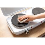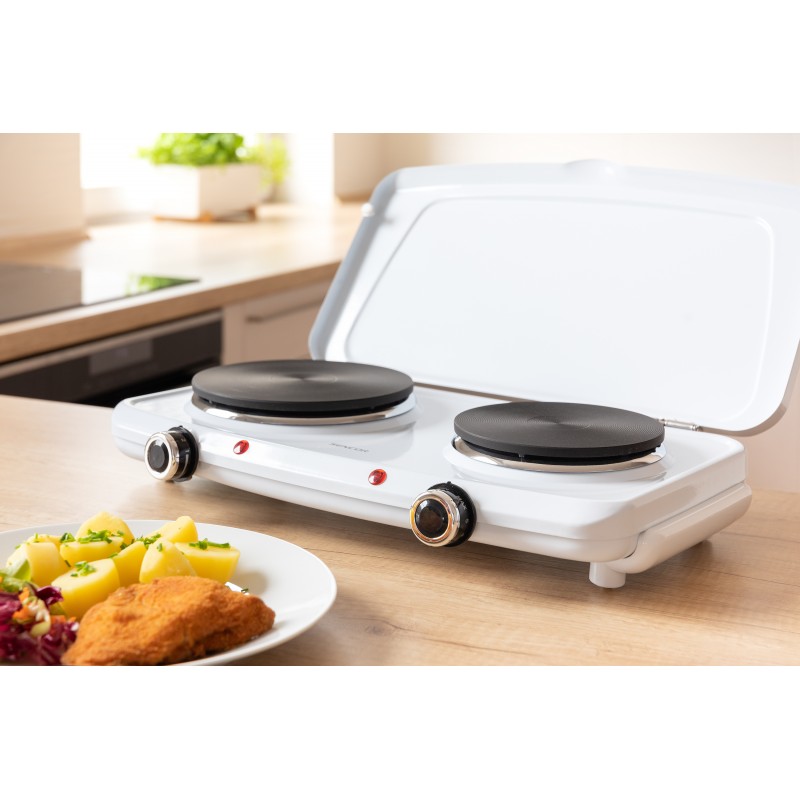Idealno za studentske domove, vikendice ili kampiranjeDva kuhala s promjerom od 18 i 15 cmPromjenjiva regulacija temperatureDva svjetla pokazivačaZaštita od pregrijavanjaProtuklizne nogeKompaktne dimenzije koje štedi prostorJednostavno rukovanje i čišćenjeVrlo prijenosnoDuljina kabela za napajanje: 0,8 mDimenzije (širina x dubina x visina): 480 x 280 x 82 mmTežina: 4,9 kgMaksimalni ulaz snage: 2.500 W