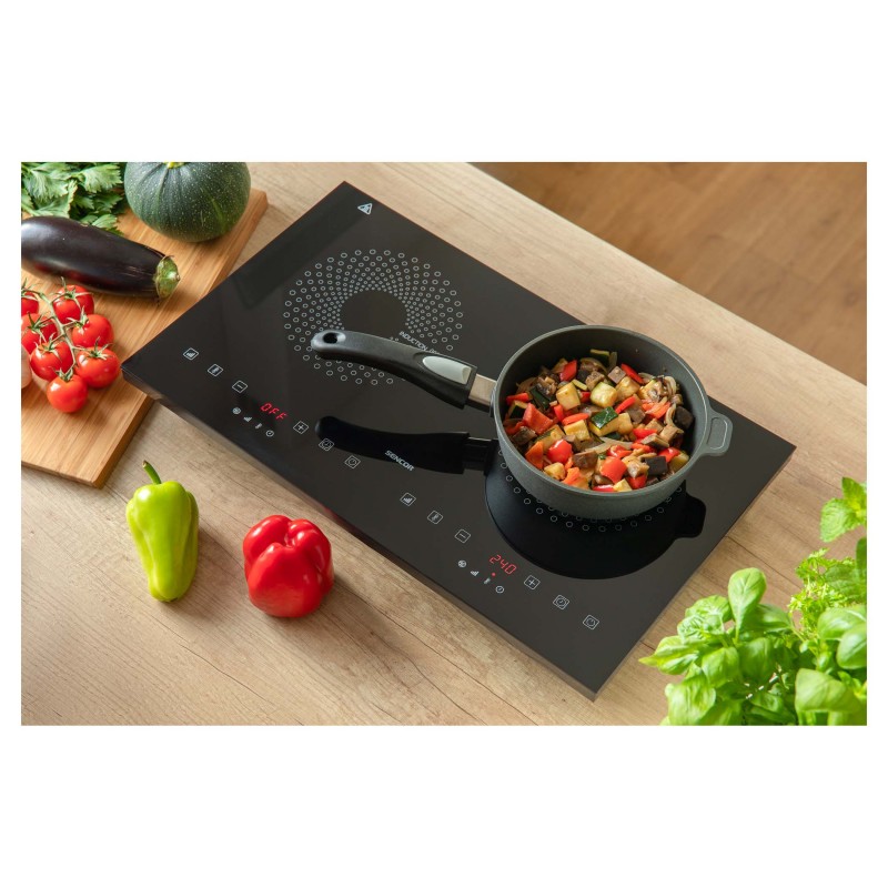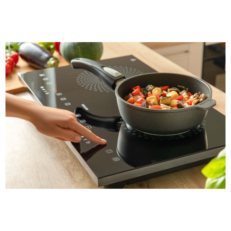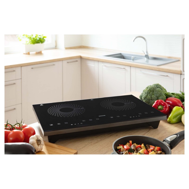 ·        Lako upravljanje pločom na dodir s klizačem za podešavanje temperature i snage. ·        Staklokeramičko indukcijsko kuhalište koje je lako čisti ·        Visoko učinkovito indukcijsko kuhanje štedi vrijeme i struju Staklokeramičko indukcijsko kuhalište je hladno na dodir jer se toplina indukcijom stvara izravno u posuđu (oprez, kuhalište se može djelomično zagrijati od posuđa). Indukcijsko kuhanje štedi vrijeme (60 %) i struju (50 %). Omogućuje visoku učinkovitost (do 90 %) s minimalnim gubicima topline. Kuhalištem i pojedinačnim funkcijama se upravlja pomoću tipki na dodir. Veliki LCD zaslon sa crvenim pozadinskim osvjetljenjem daje podatke o temperaturi i snazi.Jednodijelna staklokeramička površina potpuno prekriva gornju stranu kuhališta. Time se olakšava čišćenje uređaja. Budući da se toplina potrebna za kuhanje stvara u posuđu, a površina kuhališta se ne grije izravno (samo toplinom koja prelazi na njega s posuđa), ako hrana slučajno dospije iz posuđa na kuhalište, neće se na njemu zapeći.Radi pomoću mikroprocesora.Trenutan prijenos snage bez dugog zagrijavanja.Prikladno za posuđe promjera od 12 do 26 cm.Automatsko prepoznavanje posuđa za indukcijsko kuhanje (s magnetskim dnom).Opcija podešavanja temperature / snage.Temperatura je podesiva od 60 °C do 240 °C.10 tvorničkih razina grijanja u rasponu od 200 – 2000 W i 200 – 1400 W.Mjerač vremena za odgodu isključivanja do 180 minuta.Gumb za UKLJUČIVANJE/UKLJUČIVANJE za uključivanje ili prelazak u stanje pripravnosti VISOK STUPANJ SIGURNOSTI ·        Automatsko prepoznavanje posuđa i automatsko isključivanje. Kuhalište se isključuje kada se posuđe skine s ploče za kuhanje ili kada se na ploču stavi posuđe koje je neprikladno za indukcijsko kuhanje. Posuđe je prikladno ako se na dno posuđa hvata magnet.  ·        Termalni osigurač protiv pregrijavanja grijaće ploče i unutrađnjosti kuhališta sa zvučnim signalom. Prvo se oglašava signal upozorenja, zatim se kuhalište automatski isključuje.  ·        Indikator preostale topline. Ako temperatura površine kuhališta prijeđe 80 °C (toplina koju stvara dno posuđa), na zaslonu se prikazuje upozorenje „HEAT“ (TOPLINA). Upozorenje će nestati kada temperatura površine padne ispod 80 °C. ·        Automatsko isključivanje kuhališta nakon 2 sata bez aktivnosti. TEHNIČKE SPECIFIKACIJE: Ulazna snaga 3400 WDimenzije (širina × dubina × visina): 600 × 360 × 75 mmMasa: 4,57 kgNapon i frekvencija: 220 V – 240 V ~ 50/60 HzMjerač vremena: odgoda isključivanja do 180 minutaLijeva grijaća ploča: 10 razina snage od 200 do 2000 WDesna grijaća ploča: 10 razina snage od 200 do 1400 WPostavke temperature od 60 do 240 °C Komande: senzorske komande na dodirTermalni osigurač protiv pregrijavanja