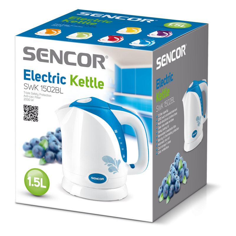 Zapremina 1.5 lOznaka razine vode na obje straneSpremište za kabel za napajanje u bazi uređajaSigurnosno zaključavanje poklopcaFiltar za uklanjanje nečistoća i naslaga, odvojiv i perivGrijač je skriven ispod grijaće baze od nehrđajućeg čelikaTrostruka zaštita:Zaštita od pregrijavanje kad nema vode kod uključenja uređajaAutomatsko isključivanje kod podizanja s bazeAutomatsko isključivanje kad voda proključaSredišnji priključak od 360°On/Off prekidač za uključivanje/isključivanje na ručkiSvjetlosni indikator upaljenosti uređajaErgonomski oblikovana ručkaUlazna snaga 2000 WSunlight kontroler