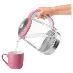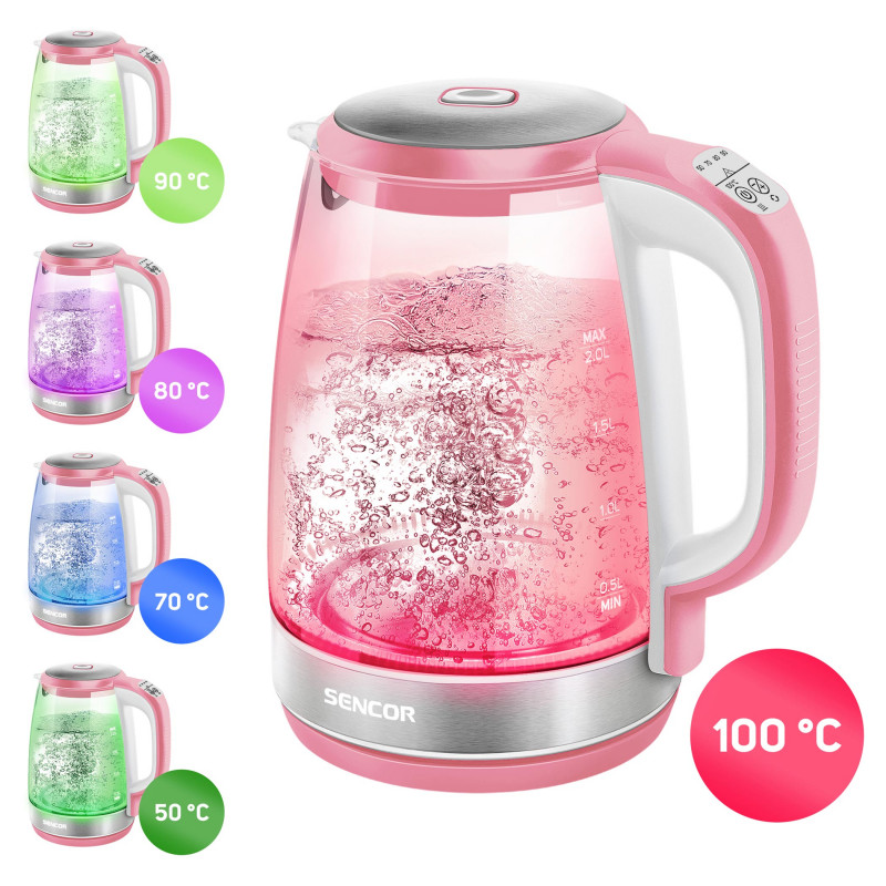 Kapacitet 2,0 l Održavajte temperaturu 30 minuta Ulaz snage: 2 200 W Postavke temperature vode: 50-70-80-90-100 °C DVA NAČINA RADA: Zagrijte vodu na 100 °C Zagrijte vodu na odabranu temperaturu (50-70-80-90-100 °C) i održavajte tu temperaturu Postignut zadani zvuk temperature Filtar za prljavštinu i kamenac Dvostrana oznaka razine vode Spremište kabela za napajanje u podnožju UNUTARNJE LED SVJETLO S PROMJENJIVIM POZADINSKIM OSVJETLJENJEM U BOJI KOJE OZNAČAVA: Zelena kada je temperatura postavljena na 50 °C Plava kada je temperatura postavljena na 70 °C Ljubičasta kada je temperatura postavljena na 80 °C Narančasta kada je temperatura postavljena na 90 °C Pogodno i za korisnike oštećena sluha (indikatorsko svjetlo za rad)Grijaća baza od nehrđajućeg čelika s natkrivenom spiralom za grijanje Poklopac se lako otvara pritiskom na gumb TROSTRUKI SIGURNOSNI SUSTAV: Zaštita od pregrijavanja kada je uključena bez vode Automatsko isključivanje kada se ukloni iz baze Automatsko isključivanje kada se dostigne točka vrenja DIMENZIJE I SPECIFIKACIJE Središnji STRIX priključak 360 ° Težina bez baze: 930 gNapon i frekvencija: 220 – 240 V ~ 50/60 Hz