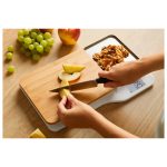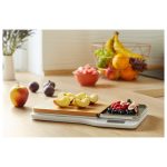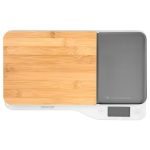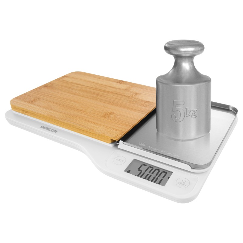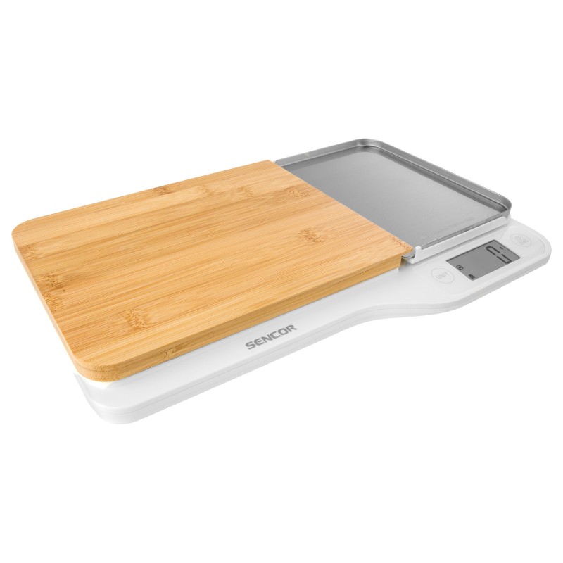 Elektronička kuhinjska vaga s daskom za rezanje od pravog bambusa i odvojivim pladnjem od nehrđajućeg čelika4 senzora za veću preciznost vaganjaFunkcija TARIRANJAKontrastno pozadinsko svjetlo za dobru čitljivostRaspon vaganja do 5 kg / 11 lb (preciznost do 1 g / 0,1 oz)Pokazivač volumena vode i mlijekaAutomatsko isključivanjeIndikator prazne baterije i preopterećenjaPriloženi dodaci: 2 × baterija AAA od 1,5 V