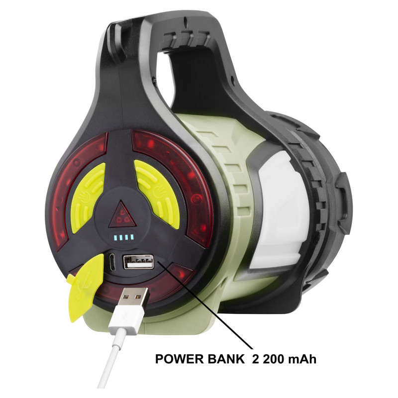 Ova višenamjenska svjetiljka praktični je pomagač s 3W prednjim svjetlima i mogućnošću punjenja mobitela, tableta ili druge elektronike zahvaljujući funkcijama Powerbanka.Svjetiljka također ima dva bočna LED svjetla COB i crveno svjetlo upozorenja sa stražnje strane.Ugrađena Li-ion baterija kapaciteta 4400mAh.Funkcija:- prednja svjetla 100% – 400 lm (8-10 h); 50% – 250 lm (20 h); bljesak (40 h);- bočno svjetlo 100% – 200 lm (15-20 h); 50% – 100 lm (40 h);- stražnje crveno svjetlo: statički / strobonski / rotirajući kotač (20-30 h).Napajanje: 5 V; 1 ATip baterije: 2 x 2200 mAh Li-Ion (3,7 V)Powerbank funkcija – izlaz: 5 V; 1 Anaknadni sjaj: 150 m (400 lm)Trajnost: IP 44Težina: 493 gDimenzije: 210 x 100 x 145 mmKomponente paketa : remen