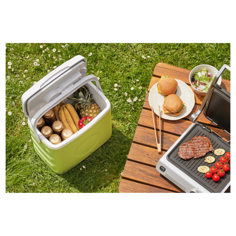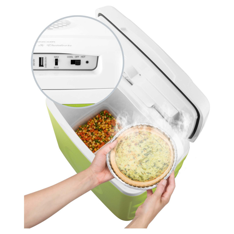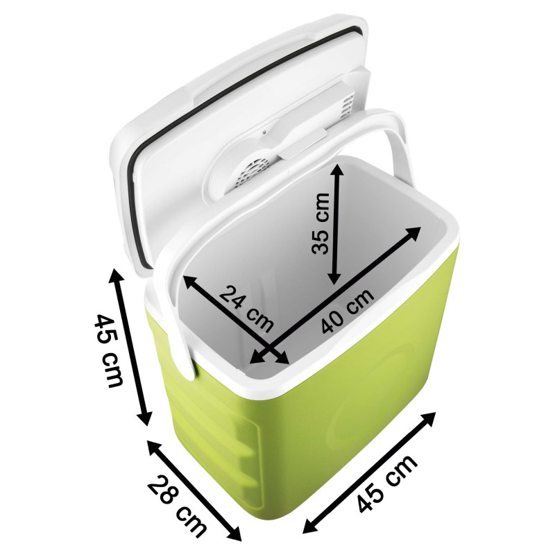 Unutarnji volumen 30 l (29 l sa zatvorenim poklopcem) Funkcija hlađenja i grijanja 3 opcije izvora napajanja: (230 V / 12 V iz utičnice automobila / USB) ZNAČAJKAMA Unutarnji volumen: 30 l Raspoloživi volumen: 29 lUključujući 2 umetka za hlađenjeFukcija hlađenje, ali nudim i funkciju grijanja Moderan dizajn, idealan za kućnu i vanjsku upotrebuVelika ručka za jednostavno nošenje na piknik ili prilikom kampiranjaMaksimalna razina buke: 42 dB (A)3 opcije izvora napajanja AC 220-240 V  DC 12 V – 12 V utičnica za automobil napajanje putem 5V USB-a – na primjer putem powerbank Ulaz snage: 55 W / 45 W / 10 W Samo 10 Wu ECO načinu rada Maksimalna snaga hlađenja 18 °C do 20 ° C ispod temperature okoline Maksimalna snaga grijanja do 50-60 ° CIzolacija: CiklopentanDimenzije (š × h × d): 460 × 440 × 292 mmTežina: 5,1 kg DIMENZIJE I TEŽINA Visina: 44 cm Širina: 46 cm Dubina: 29,2 cmTežina: 5,1 kgBoja: zelena s bijelom