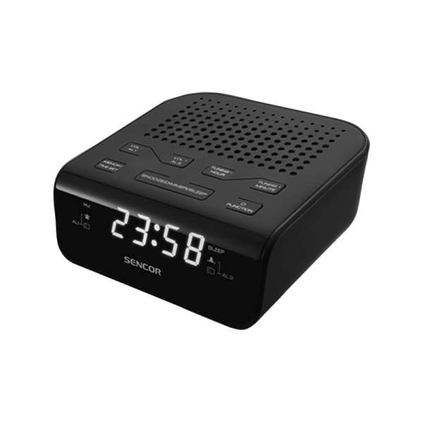 LED zaslon 0,6 “(1,5 cm)PLL FM radio20 unaprijed podešenih stanicaDvostruki alarmRazine osvjetljenja zaslona visoka/niskaBuđenje uz zvučni signal ili radioFunkcija spavanja, funkcija odgode alarmaPričuvno napajanje iz baterije: 2 x 1,5 V AA (baterije nisu uključene)Napajanje: AC 230V, 50 HzPotrošnja: 3,5 WDimenzije: 120 x 50 x 120 mmTežina: 365 g