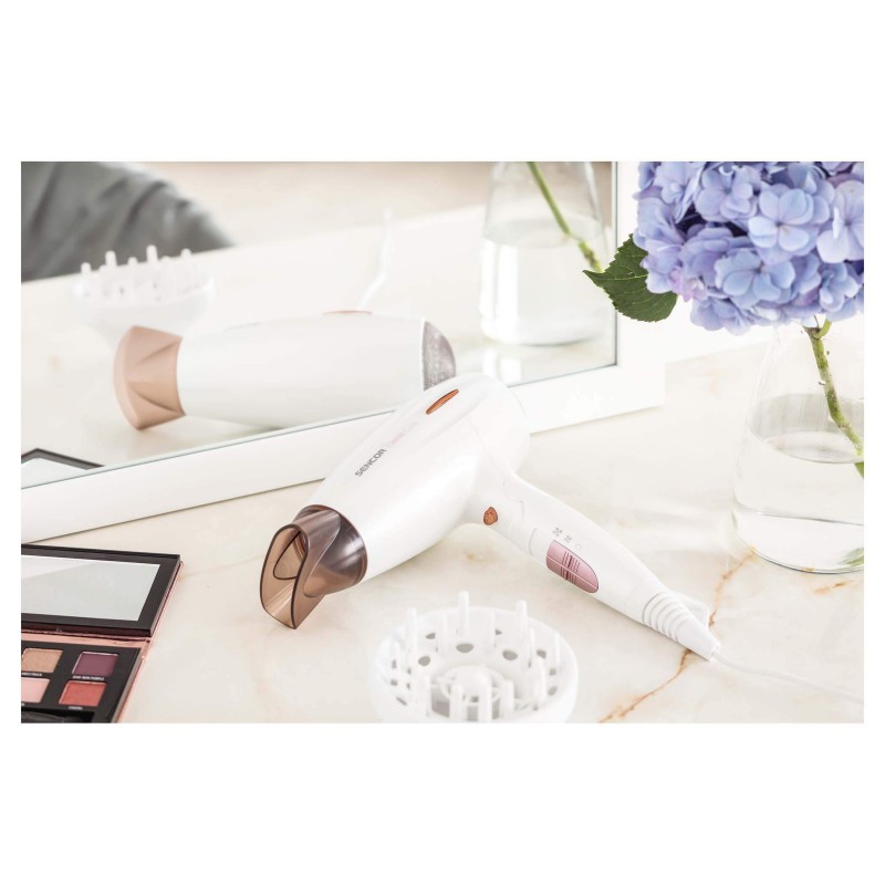 Dugotrajni istosmjerni motor Snaga: 2.000 vata podešavanje temperature za 3 stupnja 2 stupnja podešavanja brzine jamče savršen protok zraka Cool Shot funkcija za savršenu fiksaciju frizure   IONSKA FUNKCIJA Jamči svilenkastu i sjajniju kosu bez uvijanja Omogućuje brže sušenje Smanjuje statički elektricitet (jednostavno češljanje kose) Sprječava oštećenje kose  Ergonomskioblikovana ručka za ljevoruke i dešnjake Uklonjiva stražnja rešetka za lakše čišćenje Valovita spiralagrijanja jamči stalnu temperaturu koja sprječava oštećenje koseViseće oko Termalni osigurač štiti motor od pregrijavanja   Pribor: Tanki, suženi nastavak difuzor glasnoće Duljina kabela za napajanje: 1,8 m