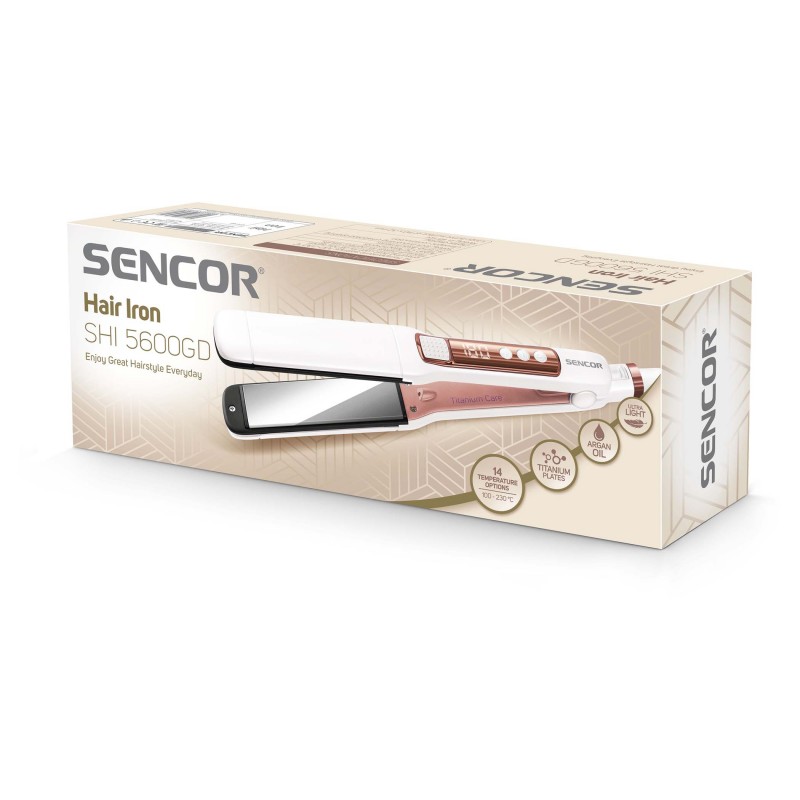 Sencor uređaj za ravnanje kose SHI 5600GD ·         JA SAM PEGLA ZA KOSU SENCOR SHI 5600GD SA UKLONJIVIM NASTAVCIMA ·         Napravite lijepu frizuru brzo i jednostavno. Ja sam glačalo za kosu SHI 5600GD tvrtke Sencor  i moj je posao stvoriti frizuru po vašoj želji. Imam tri zamjenjiva dodatka koji dodatno poboljšavaju rezultirajući stil. Njih se lako spajaju i uklanjaju, a budući da su kompaktni, ne zauzimaju prostor ni u manjoj prtljazi. Osim toga, Sencor me učinio predivnim bijelim dizajnom s upečatljivim osobinama koje mi daju pravi dodatan osjećaj. ·         MOJI PRILOZI SU: 1. Pričvrstite četkom za ispravljanje kose uz održavanje prirodnog izgleda 2. Češalj za češljanje za češljanje kose tijekom peglanja 3. Poseban dodatak za ravnomjernu primjenu argonovog ulja tijekom glačanja   ·         UPOZNAJTE POVRŠINE ZA GLAČANJE OD TITANA ·         Svidjet će vam se moje ploče od titana prvi put kada prstom kliznete po njima! Zahvaljujući njima mogu se lako pobrinuti za sve tipove kose, bilo da ste obdareni bujnim kovrčama ili finom kosom. Vrlo brzo se zagrijavaju i obogaćeni su ionskom tehnologijom koja neutralizira statičku energiju. Vaša će kosa uskoro postati elastičnija, sjajnija i podatnija za daljnji tretman. ·         IMAM 14 PRILAGODLJIVIH TEMPERATURA I BRZO ZAGRIJAVANJE ·         Podesite temperaturu za lako i brzo glačanje kose. Digitalni zaslon olakšava podešavanje temperature vašim potrebama. Postoji 14 temperatura u rasponu od 100-230 ° C u stupnjevima od deset stupnjeva. Nema više dugotrajnog zagrijavanja! Super sam brz i dosegnem 230 ° C u samo dvije minute.  ·         OSIGURAVAM PRAKTIČAN RAD KORISNIKA U SVIM SMJEROVIMA ·         Udobno je rukovanje također važno! Jednostavno moram istaknuti svoju ultra laganu konstrukciju koja je tanka, zaobljena i savršeno se uklapa u vašu ruku. To osigurava ugodno rukovanje, ali i mogućnost izrade lijepih kovrča. Kabel vam neće uzrokovati gužvu jer se može zakretati za 360 ° i savršeno se prilagođava u bilo kojem smjeru ·         PEGLA ZA KOSU 14 podešavanja temperature 100-230 ° C  Titanijska površina ploče za glačanje za maksimalnu udobnost i elegantne rezultate Privitak četka za ispravljanje kose za održavanje prirodnog izgleda  Češalj za češljanje za češljanje kose tijekom peglanja Poseban dodatak za ravnomjerno nanošenje arganovog ulja tijekom peglanja Tanak dizajn idealan za ravnanje i oblikovanje kose Otvorite i zatvorite sigurnosnu bravu ·         KABEL ZA NAPAJANJE okreće se za 360 ° kako bi se spriječilo uvrtanje i zatezanje kabel napajanja prekriven zaštitnim tekstilom za maksimalnu sigurnost 180 cm dugačak kabel za maksimalnu udobnost ·         Izuzetno lagan dizajn, samo 295 g ·         Zaslon s bijelim pozadinskim osvjetljenjem ·         Jednostavno i jednostavno ravna kosu ·         Vrijeme zagrijavanja do 170 ° C: 1 min ·         Vrijeme zagrijavanja do 230 ° C: 2 min ·         Temperatura: 100 –230 ° C ·         Površina ploče za glačanje: 110 × 32 mm ·         Ulaz snage: 55 W ·         Dimenzije (dužina × dubina × visina): 285 x 40 x 38 mm ·         Težina: 295 g ·         Garancija 24 mjeseca
