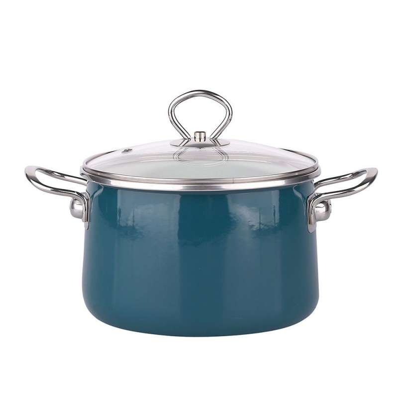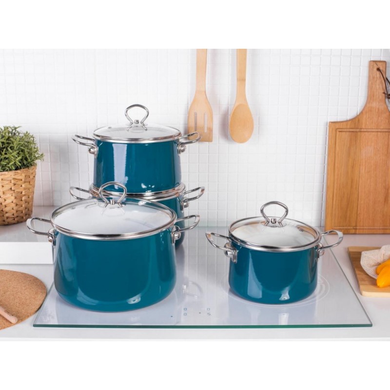 Set lonaca Silesia Rybnik za plin i indukciju Izydor sa staklenim poklopcima, plave boje Emajlirani lonci nježnih boja u kojima kuhate ukusno i zdravo. Set lonaca uključuje: 1 x lonac s poklopcem 16 cm, visina – 11,3 cm, kapacitet – 2,1 l,1 x lonac s poklopcem 18 cm, visina – 12,2 cm, kapacitet – 3,1 l1 x lonac s poklopcem 20 cm , visina – 13,1 cm, kapacitet – 4,1 l1 x lonac s poklopcem 22 cm, visina – 14,6 cm, kapacitet – 5,5 l
