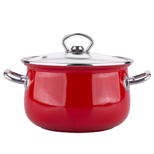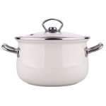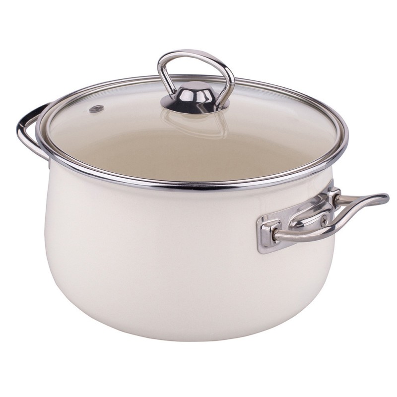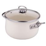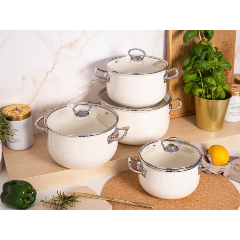 Set lonaca Silesia Rybnik za plin i indukciju Kate sa staklenim poklopcima, krem boja Emajlirani lonci nježnih boja u kojima kuhate ukusno i zdravo. Set lonaca uključuje: 1 x lonac s poklopcem 16 cm, visina – 11,5 cm, kapacitet – 2,1 l,1 x lonac s poklopcem 18 cm, visina – 13 cm, kapacitet – 2,9 l1 x lonac s poklopcem 20 cm, visina – 14,5 cm, kapacitet – 3,7 l1 x lonac s poklopcem 22 cm, visina – 15,8 cm, kapacitet – 5,0 l