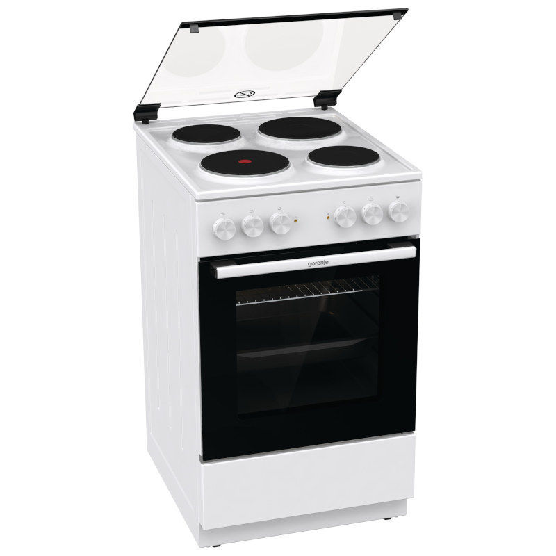 Gorenje električni štednjak, dimenzije aparata (ŠxVxD): 50 × 85 × 59,4 cm. Iskoristivi obujam pećnice: 68 l. 2-struko ostakljenje vrata pećnice s 1-strukom temperaturnom refleksijom (CompactDoor). Ergonomski gumb. Preklopni poklopac. Energetski razred A.