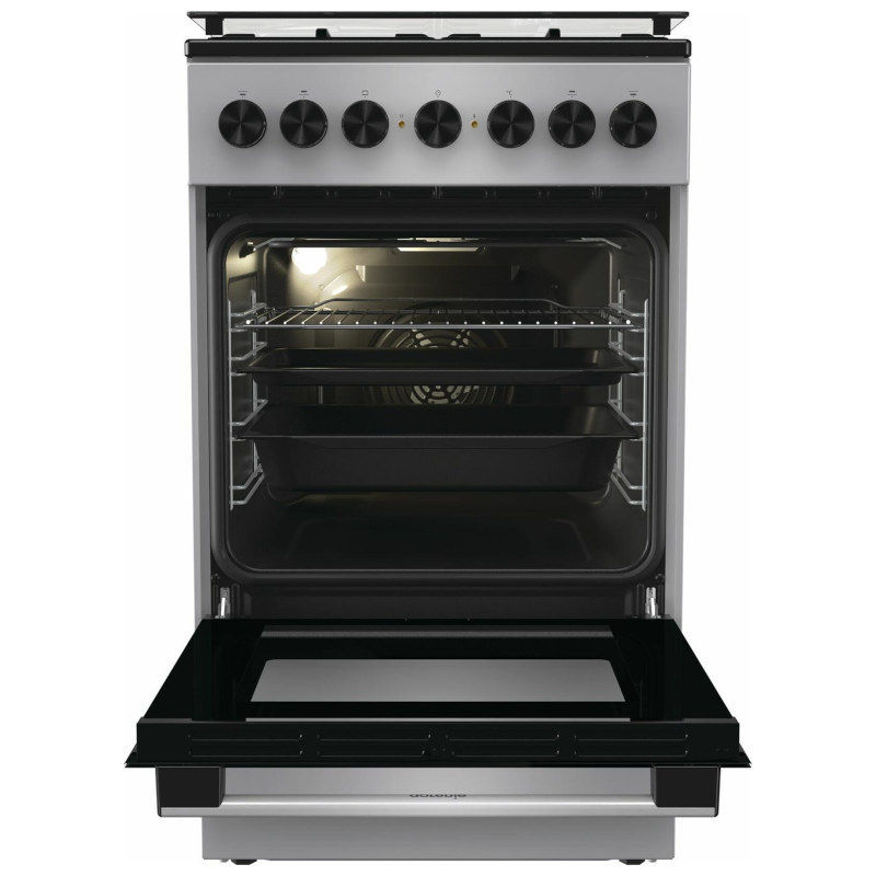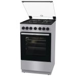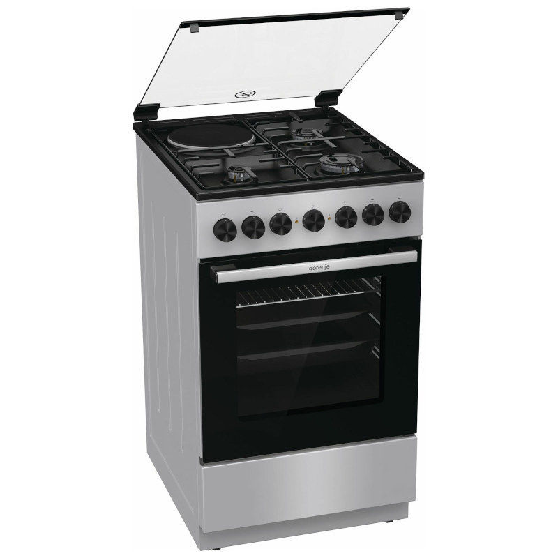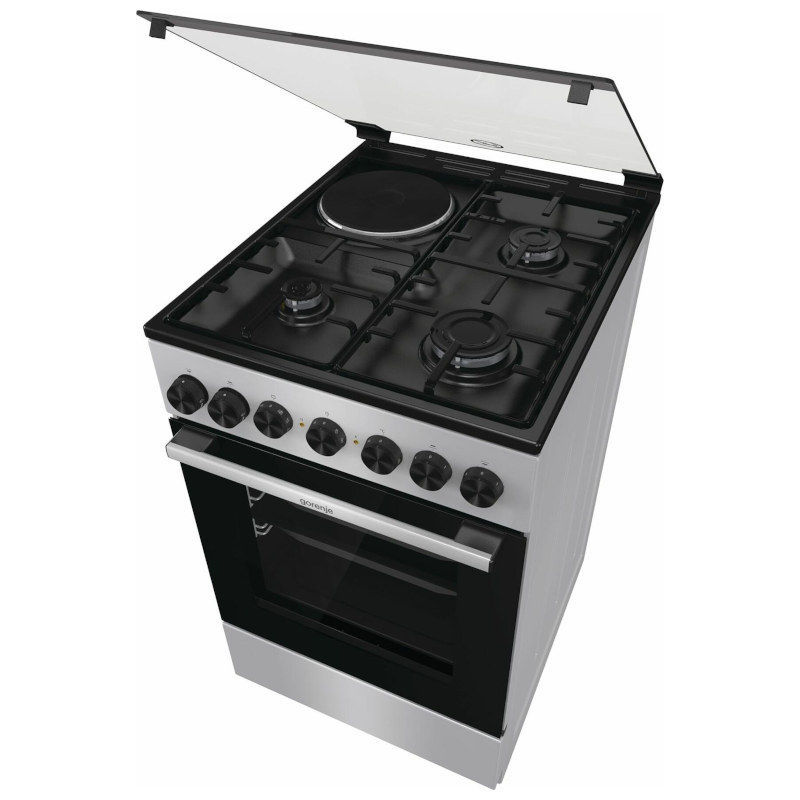 Gorenje kombinirani štednjak (3x plin + 1x električna ploča), dimenzije aparata (ŠxVxD): 50 × 85 × 59,4 cm. Ergonomski gumb. Električno jednoručno paljenje plinskih plamenika. Konvencionalna pećnica – 70 l. Dvoručno električno paljenje plinskih plamenika. Sigurnosni plinski plamenik. Preklopni poklopac. Energetski razred A.