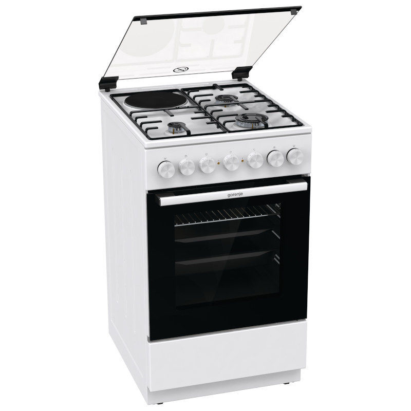 Gorenje kombinirani štednjak (3x plin + 1x električna ploča), dimenzije aparata (ŠxVxD): 50 x 80 x 59,4 cm. Ergonomski gumb. Električno jednoručno paljenje plinskih plamenika. Konvencionalna pećnica – 70 l. Dvoručno električno paljenje plinskih plamenika. Sigurnosni plinski plamenik. Preklopni poklopac. Energetski razred A.