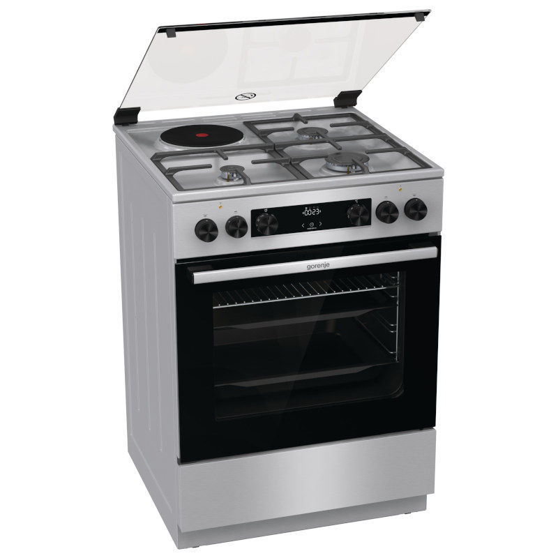 Gorenje kombinirani štednjak 3 plinska grijača + 1 električni. Štednjak je u boji nehrđajućeg čelika, multifunkcionalna pećnica s grilom velikog volumena 71 l. Dimenzije aparata visina: 850 mm, širina: 600 mm i dubina: 600 mm. Energetski razred A.
