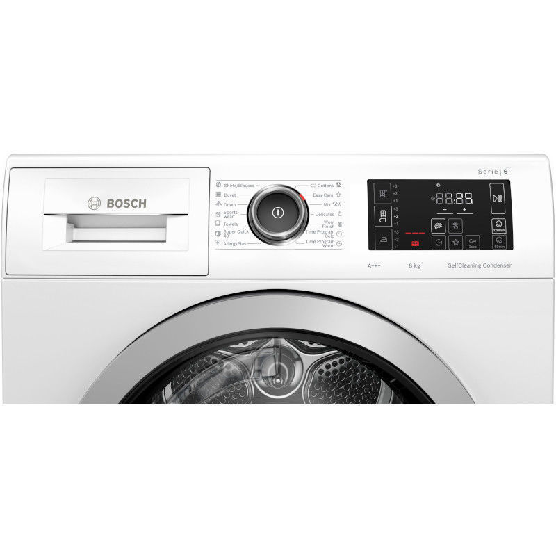 Bosch sušilica rublja s toplinskom pumpom, kapacitet punjenja: 8 kg. SelfCleaningCondenser: jamči visoke performanse sušilice za rublje uz stalno nisku potrošnju energije A+++ zahvaljujući automatskom čišćenju kondenzatora. AutoDry: automatski suši do željenog stupnja suhoće. AntiVibration Design: izuzetno stabilan i vrlo tih zbog posebne zaštite od vibracija. Klimatski prihvatljiva sušilica s ekološki najprihvatljivijim sredstvom za rashlađivanje (R290). Zaslon DirectSelect: izuzetno udobna upotreba zaslona s jednostavnim sučeljem za jednostavan odabir programa.
