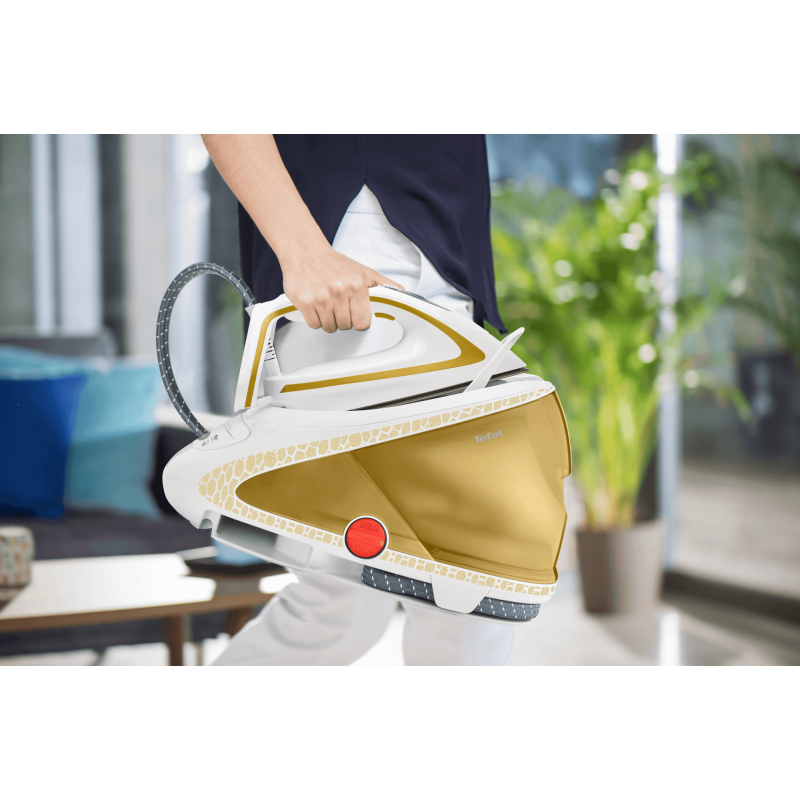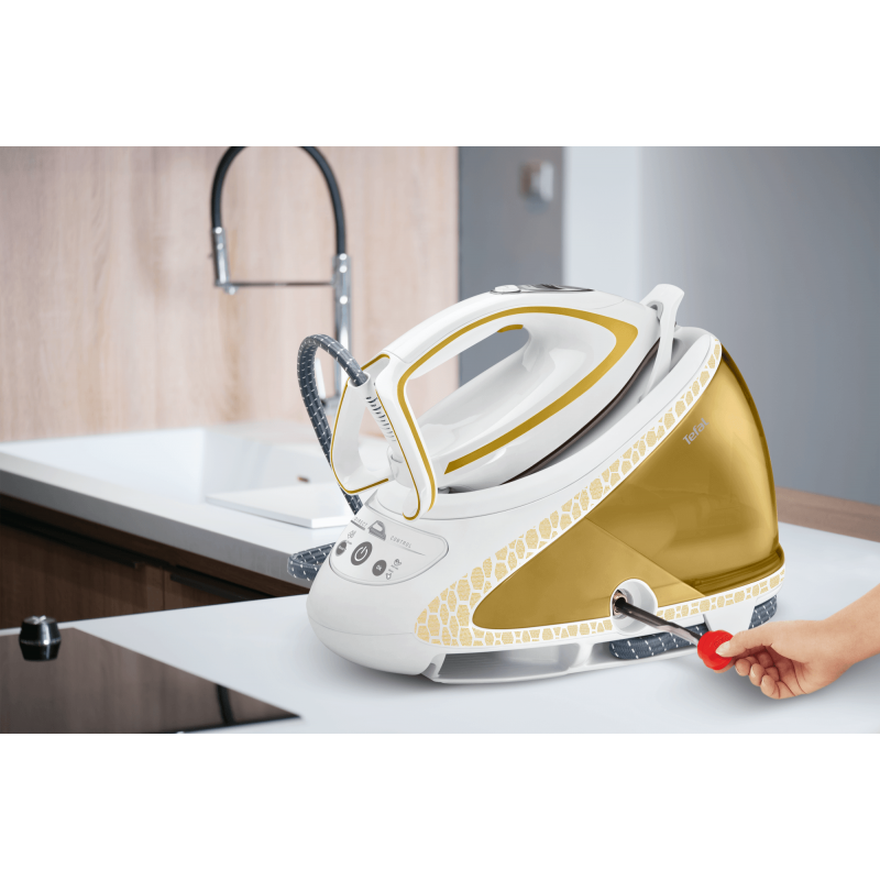 Visokotlačni parni generator s mogućnošću intenzivnog i iznenadnog ispusta pare Tehnologija Durilium AirGlide Omogućuje čišćenje kamenca s tehnologijom Tefal Autoclean Intuitivna pregledna ploča Direct Control Snaga 2600 W Tlak pare 8 bara Ispust pare 580 g/min Materijal ploče za glačanje keramika Automatsko isključivanje Da Automatske postavke temperature Da Dužina kabela za napajanje 1,7 m Masa5,5 kg Boja bijela/zlatna