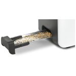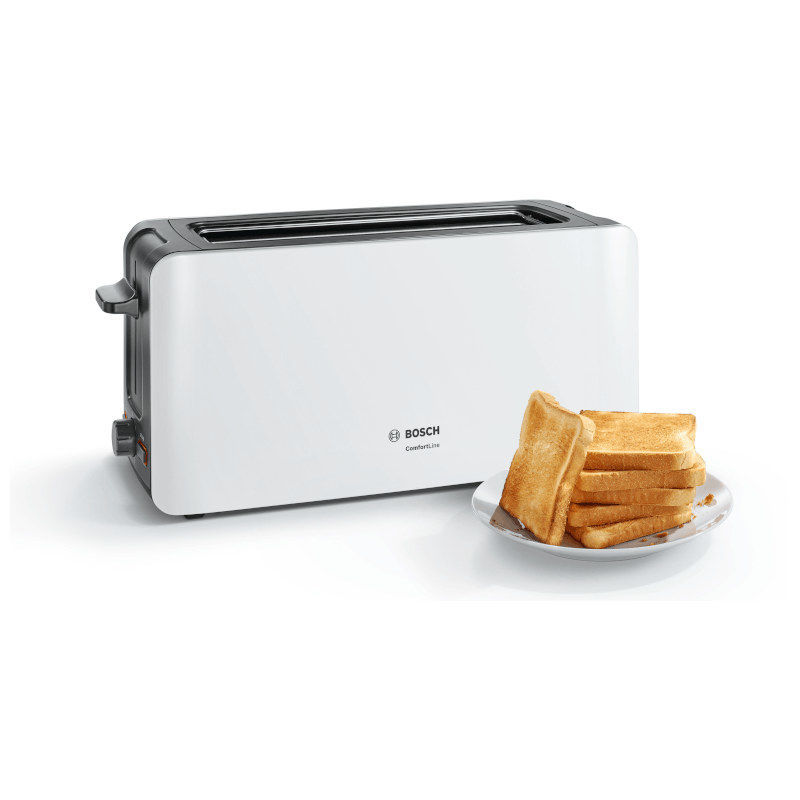 Toster, ComfortLine, Bijeli. Ugrađena rešetka za zagrijavanje koja se može sklopiti. Funkcija podgrijavanja: ponovno zagrijava vaš tost, koji tako postaje hrskaviji i ukusniji. Jednakomjerno pečenje s automatskim centriranjem kruha. High Lift: jednostavno uklanjanje čak i malih kriški kruha. Toster s dubokim utorima za posebice duge kriške kruha ili dvije kriške tosta.