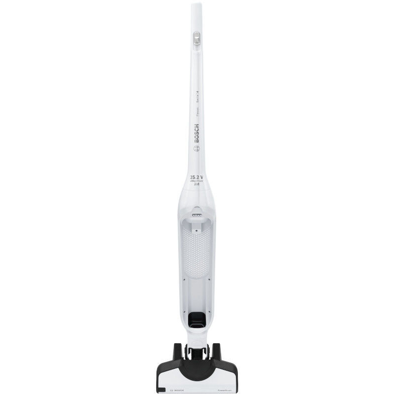 Bosch akumulatorski usisavač Serie | 4 Flexxo 25.2V, bijela boja. Praktično, brzo i temeljito. Ugrađeni nastavci omogućuju još fleksibilnije svakodnevno čišćenje. Čišćenje na svim razinama: uz 2u1 plus nastavak, sva prašina je usisana – od poda do stropa. Praktična funkcionalnost 2u1: ručni i štapni usisavač u jednom uređaju za još veću fleksibilnost. Temeljiti rezultati čišćenja na svim vrstama podova zahvaljujući visokoučinkovitoj tehnologiji bez vrećice i četki za sve vrste podova AllFloor HighPower Brush. Samostojeći stalak: uvijek dostupno, za brzo korištenje, jednostavno za pospremanje i punjenje. Savršena udobnost: jednostavan za upotrebu, pospremanje i čišćenje zahvaljujući maloj težini i sistemu Easy Clean System.