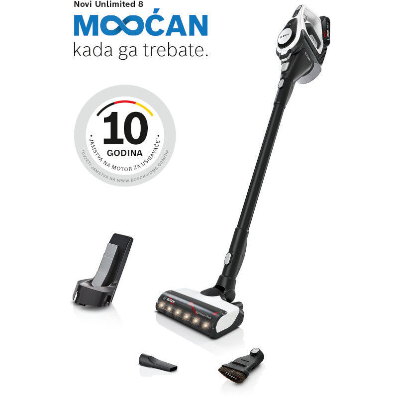Akumulatorski usisavač, Unlimited Gen2, Bijeli. Izuzetno snažan: bez kompromisa kod djelotvornosti, budući da je bežični uređaj jednako snažan kao i onaj s kablom. Četka AllFloor HighPower s LED svjetlima: poboljšana djelotvornost čišćenja s integriranim podnim svjetlima. Auto način rada: ručno preklapanje više nije potrebno zahvaljujući automatskoj prilagodbi za sve vrste podova. POWER FOR ALL ALLIANCE: baterijski je sklop kompatibilan s mnogim Bosch proizvodima i drugim robnim markama.
