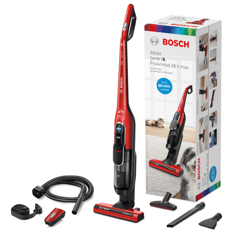 Za ljubitelje kućnih ljubimaca. Naš bežični visoko učinkoviti usisavač s četkom ProAnimal Brush za do 30% brže čišćenje. Četka ProAnimal: savršena za vlasnike kućnih ljubimaca i sve vrste podova. S dodatnim valjkom za životinjsku dlaku. Bosch Lithium-Ion Technology: izdržljive i snažne baterije za punjenje, iznimno dugi životni vijek i kratko razdoblje punjenja. Maksimalno prilagođavanje: bežično usisavanje bez ograničenja, na tapeciranom pokućstvu ili u kutevima, zahvaljujući profesionalnom kompletu pribora. SmartSensor Control: Visoka učinkovitost u radu zahvaljujući kontroli senzora s LED indikatorom. RotationClean: brza i jednostavna zamjena filtra – nema potrebe bo pranju filtra.