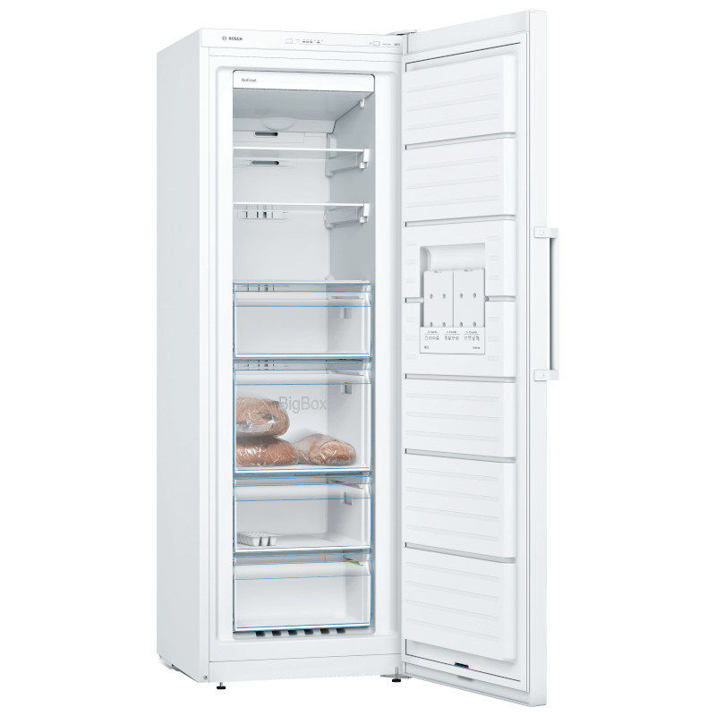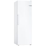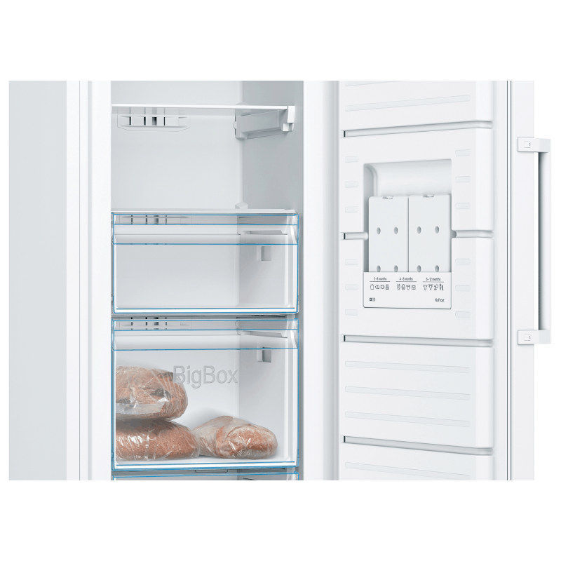 Bosch Serie 4, samostojeći zamrzivač dimenzija 176 x 60 cm u bijeloj boji. Ledenica NoFrost s elektroničkim podešavanjem temperature: željenu temperaturu podesite precizno i jednostavno. VarioZone: veća fleksibilnost uz pomoć višenamjenskih staklenih polica i ladica u prostoru za zamrzavanje. NoFrost: više nikada nećete morati odmrzavati zamrzivač. BigBox ladica: jednostavno slaganje posuda za pohranu i većih zamrznutih namirnica. Sjajna stražnja stijenka s višestrukim protokom zraka MultiAirflow: ravnomjerno cirkulira hladan, svjež zrak kako bi se održale dosljedne temperature. Energetski razred E.