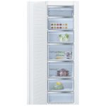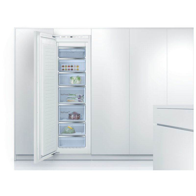 BOSCH zamrzivač ugradbeni serija 6, dimenzije 177.2 x 55.8 cm, fiksna šarka. Ledenica NoFrost s elektroničkim podešavanjem temperature: željenu temperaturu podesite precizno i jednostavno. VarioZone: veća fleksibilnost uz pomoć višenamjenskih staklenih polica i ladica u prostoru za zamrzavanje. Automatsko super zamrzavanje: optimalno rješenje za brže zamrzavanje manjih količina hrane uz istovremenu zaštitu zamrznutih namirnica od odmrzavanja zahvaljujući detekciji povišenja temperature i automatskom snižavanju temperature. NoFrost: više nikada nećete morati odmrzavati zamrzivač. BigBox ladica: jednostavno slaganje posuda za pohranu i većih zamrznutih namirnica.